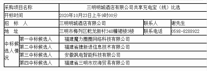 三明明城酒店有限公司共享充电宝(线)比选中标公示